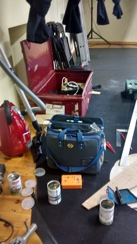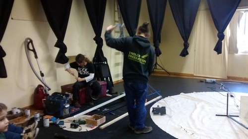 Ils sont arrivés ce matin au théâtre et sont en train de tout installer pour le spectacle : Le théâtre est complètement modifié : les rideaux des coulisses sont relevés pendant qu’ils installent tout le matériel qui sera utilisé pendant le spectacle.
