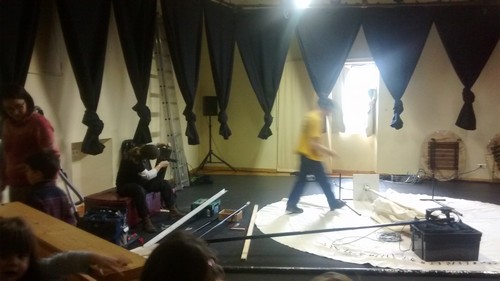 Nous nous rappelons de tout ce que nous ont dit les artistes et techniciens de la compagnie et de ce qui nous a le plus marqués : « la perceuse faisait beaucoup de bruit », « c’était très intéressant de voir Marco faire des trous avec la perceuse pour faire tourner le parasol »… « on verra bien lundi si ça aura marché ! » , « La scène était ronde, pas comme d’habitude, c’était bizarre, on se demande ce que ça va donner ! », « on voyait tout le bazar qu’il y avait dans les coulisses, ils vont avoir du rangement à faire ! »,