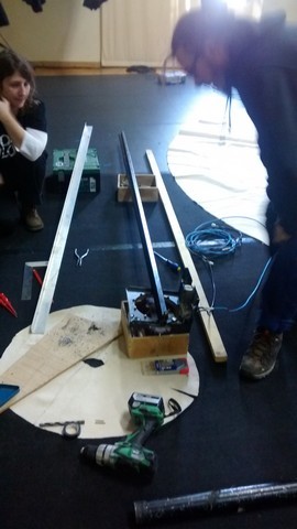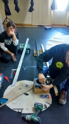 Marco utilise une perceuse pour installer sous le pied du parasol un morceau de métal qui le fera tourner. Comme il n’est pas comédien, il ne pourra pas venir sur la scène pendant le spectacle, alors il installe aussi des fils électriques pour brancher le parasol : les fils vont aller du parasol jusqu’à la table de mixage ou un bouton permettra de télécommander le parasol quand il voudra le faire tourner…