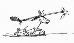 Quand ils se sont rencontrés, Virginie, Marco et tous les autres avaient très envie de travailler ensemble. Ils ont décidé de fonder une compagnie pour faire des spectacles pour les enfants, ils avaient vraiment envie que ça marche. Alors ils ont pensé qu’autrefois, quand il n’y avait pas encore de voitures, on se déplaçait en charrettes tirées par des chevaux. Les conducteurs des charrettes : les charretiers mettaient une carotte accrochée avec un bâton et une ficelle devant leur nez pour les faire avancer plus vite. Ils se sont dit qu’ils étaient un peu comme ces chevaux : ce qui les faisait avancer eux, ce qui leur donnait envie de faire des spectacles c’était de créer cette compagnie, la compagnie était donc un peu comme la carotte des chevaux. Alors ils ont décidé d’appeler la compagnie « la carotte » !