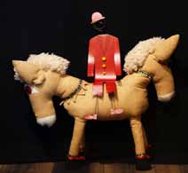 Christelle entre en scène semi costumée. Elle nous présente la petite boîte de « Pioui », chien miniature, et fait entrer sur scène en les manipulant deux personnages : un âne à deux têtes et un clown rouge, qui le monte…