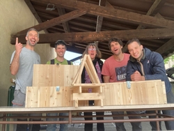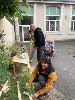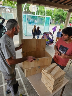 Ils avaient acheté des plaques de bois à l’avance, ils les ont découpées en planches, et le jour même ils ont apporté leurs outils de menuisiers pour terminer le travail de coupe devant les enfants.